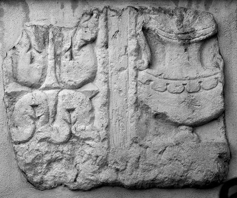 - Reste von zwei nebeneinander stehenden Bildfeldern. Rechts Krater mit Volutenhenkeln, links vegetabiles Ornament (Blattkelche).