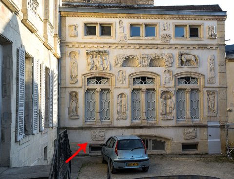 - seit 1854 an der Hoffassade des L' Hôtel Lemullier de Bressey (Vesvrotte), rue Philippe Pot Nr. 3, unten eingemauert