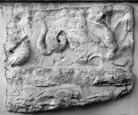 - Oben Rest eines Frieses mit Delphin, darunter vorspringender Rahmen und kleinfiguriger Tierfries (laufender Hund). Teil eines Grabbaus ?