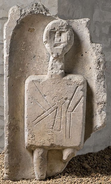 - in rahmenloser Bogennische stehender Mann, auf der glatten Oberfläche des kurzen Gewandes eingravierte Arme und Beil