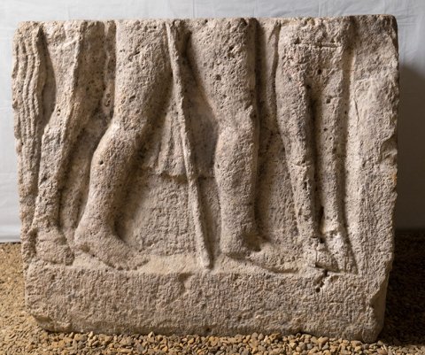 - Mythische Figuren. Seite a: bekleidete Frau (Götin?) und Beine eines Mannes im Mantel zu beiden Seiten eines Altars, um den sich eine Schlange windet. Seite b: Mercur mit Flügelschuhen und Mantel. Seite c: Dioskur (?), Beine eines vor einem Pferd stehenden Mannes mit Lanze oder Stab. Seite d: gekreuzte Beine einer männlichen Figur in kurzer Tunica und Mantel, mit Stab oder Lanze.