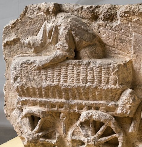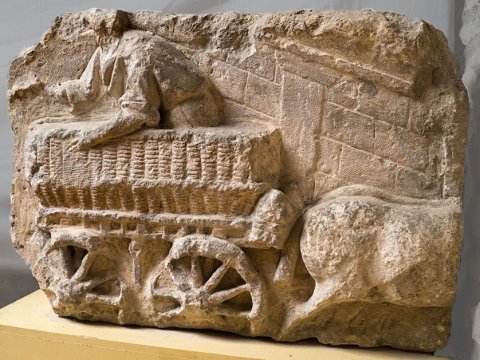 - Wagenszene: vor einer Quadermauer mit Pilaster offener vierrädriger Korbwagen mit Zweigespann. Im Wagen stehender Mann (Diener), die Hand zu einer anderen Person ausgestreckt.