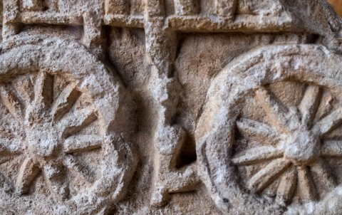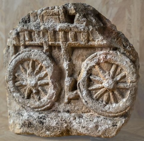 - Wagenszene: vierrädriger Leiterwagen, darauf Kiste oder Sitz für Fahrgast (?).