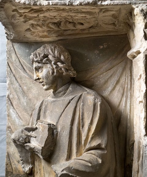 - Rechtes Drittel einer Nische mit stehendem Jüngling in halblangem Ärmelgewand, in den Händen aufgeklapptes Polyptychon. An der Unterseite der Decke Akanthuskelch, auf der Stirnseite Akanthusranke. Im Hintergrund Vorhang. Eckpilaster mit mit Blattkandelabern mit Flammen, dazwischen auf der Außenseite mit Tänien umwundene senkrechte Leiste, darauf Blattkelch mit Gesicht, unten hängendes Gefäß mit tordiertem Henkel. Auf der Sockelzone Tänien.
