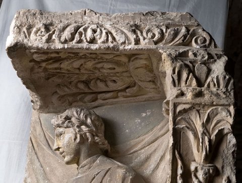- erhalten ist die rechte Ecke einer Aedicula, Relief bestoßen, Nase u. Kinn des Mannes ergänzt, Unterkante abgebr., Oberseite verbr.