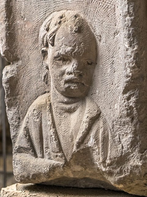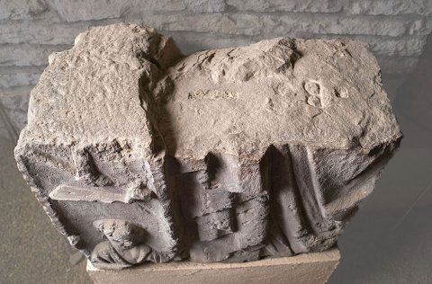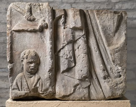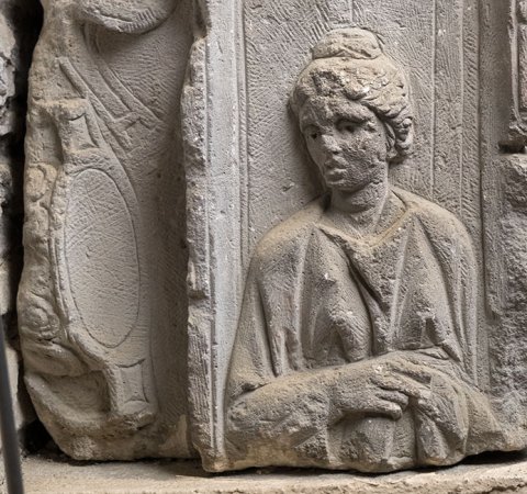 - Eckblock: auf der Vorderseite Manteldraperie einer stehenden Person, links davon Pilaster mit Werkzeug (Axt), darunter Oberkörper eines afrikanischen (?) Knaben (Diener). Auf der linken Nebenseite vor einem Pfeiler stehende Frau mit Haarknoten auf dem Oberkopf. Links anschließend Reliefzone (ovale Platte mit Henkeln, von oben herabhängendes Band).