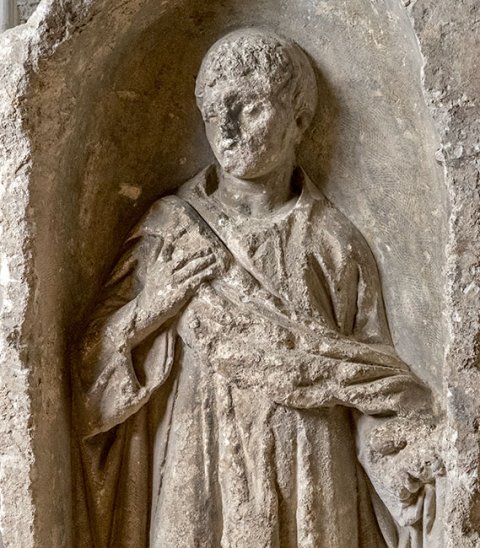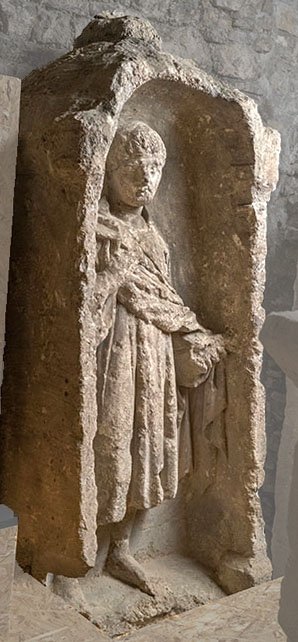 - in einer Bogennische mit Resten von Akroteren stehender Jüngling im halblangen Ärmelgewand und Mantel, in der Linken Geldbeutel ?