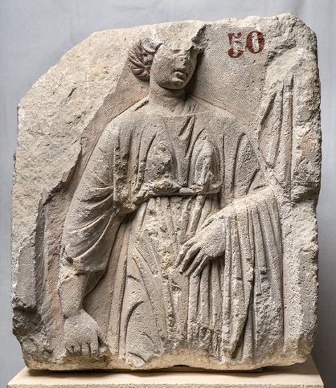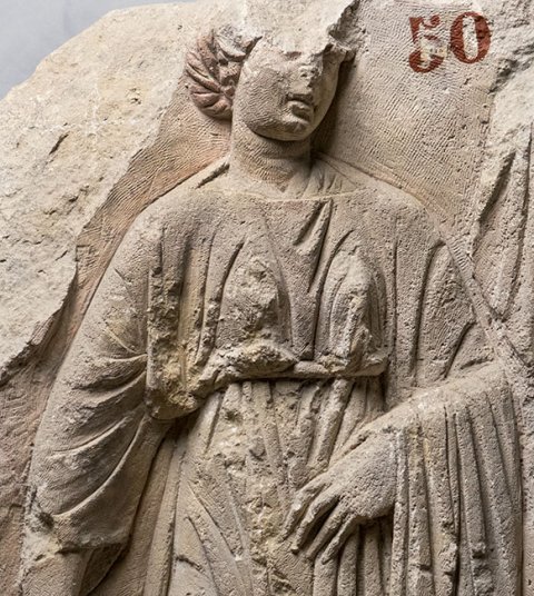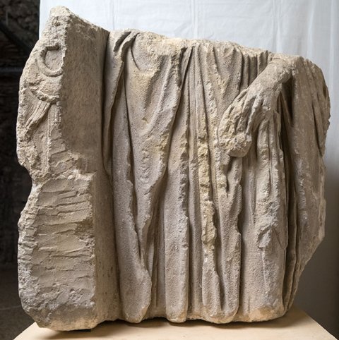 - auf zwei gegenüberliegenden Seiten Reste von großen stehenden Gewandfiguren (Frau mit Armband und Tuch in der linken Hand, an ihrer rechten Seite vorspringende Nischenwand mit Reliefresten auf der Stirnseite. Mann mit Stab im linken Arm, an seiner linken Seite Nischenwand mit verknotetem Band?). auf der Rückseite (?) kleinere Frauenfigur (Dienerin).