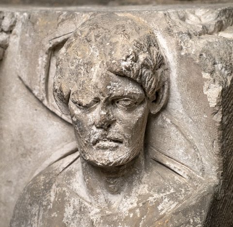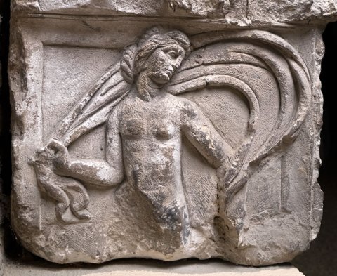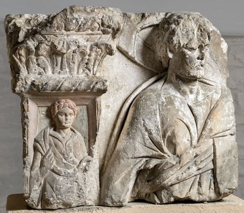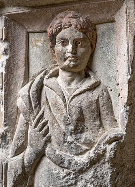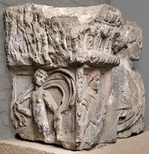 - Eckblock: auf der Vorderseite Oberkörper eines stehenden bärtigen Mannes im Mantel, hinter seinem Kopf Schlaufe einer Schärpe. Links Pilaster mit Blattkapitell, darunter Knabe in Paenula und Umhang. Auf der linken Nebenseite Relieffeld mit tanzender nackter Mänade.
