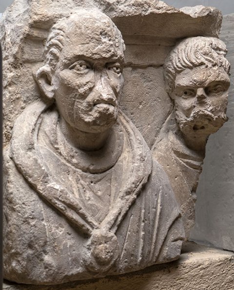 - Familie: Reste der Porträts von zwei bärtigen Männern, der linke mit kahler Stirn und Gesichtsfalten, in Mantel mit Scheibenfibel auf der Brust.