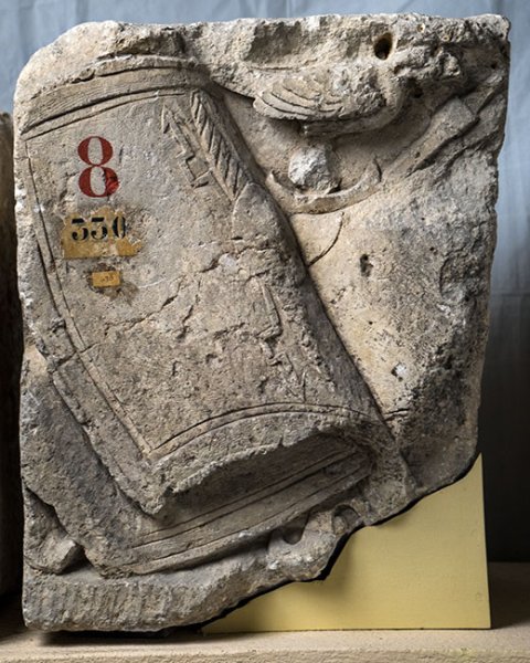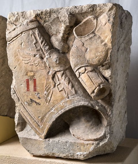 - Waffen: Panzer, Peltenschild, Schilde mit Feldzeichen (Blitzbündel), Schwert. Auf einem Fragment am oberen Rand Vogel. Auf der links anschließenden Seite Reste eines größeren Relieffeldes ?