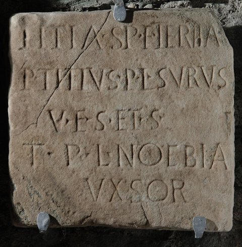 - Titia Sp(urii) f(ilia) Tertia / P(ublius) Titius P(ublii) l(ibertus) Surus / v(ivi) f(ecerunt) s(ibi) et s(uis) / T(itia) P(ublii) l(iberta) Noebia / uxsor
