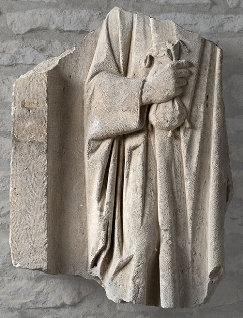 Mittelteil eines stehenden Mannes im Ärmelgewand, in der Rechten Geldbeutel
