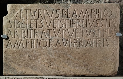 - P(ublius) Veturius / P(ublii) l(ibertus) Amphio / sibei(!=sibi) et sueis(=suis) fieri iussit / arbitratu P(ublii) Veturi(i) P(ublii) l(iberti) / Amphioravi fratris