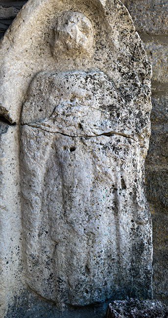 - horizontaler Bruch, Relief stark verwittert, tlw. abgeschlagen