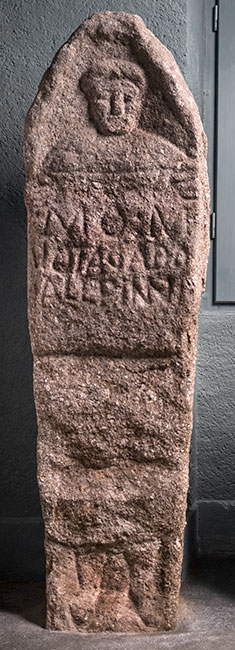 - Giebelstele mit stehendem Mann, vor dem Oberkörper Schrifttafel