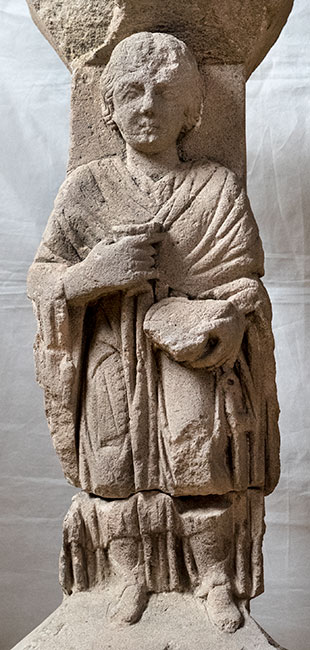 - Pfeiler mit ungegliederten Sockel und Kapitell, davor stehende Frau im Umhang, in den Händen Becher und Schale