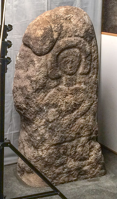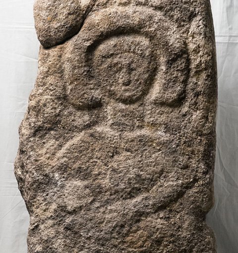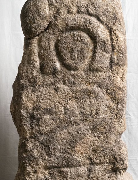 - stehender Mann (?) im kurzen Gewand, Kopf bogenförmig gerahmt (Kopfbedeckung ?)