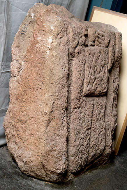 - Unterteil einer stehenden Person, in der linken Hand Becher, die Rechte hält eine viereckige Schrifttafel.