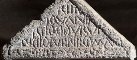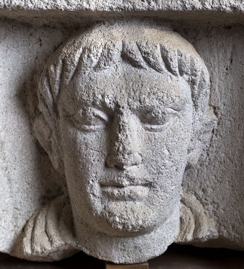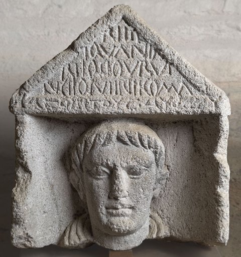 - Votivstele mit Porträt eines bartlosen bekleideten Mannes. Oben Giebelfeld mit Inschrift.