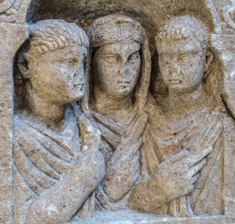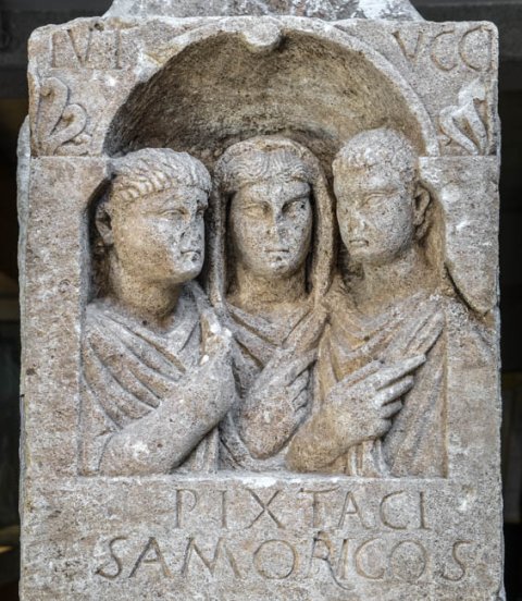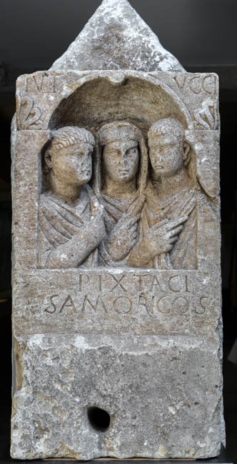 - Bogennische (Muschel ?) auf Pilastern. Brustbilder einer Familie: Frau mit Schleier zwischen zwei bartlosen Männern. Über den Pilastern Palmetten, über dem Bogen leicht zurück versetzter Giebel.