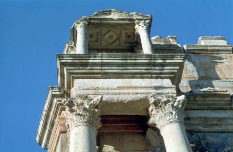 - Imp(eratori) Ca[es(ari)] M(arco) Aurelio Severo Antonino Pio Felici Aug(usto) / Parth[ic]o maximo Britannico max(imo) Germanico max(imo) / pontif(ici) [m]ax(imo) trib(unicia) pot(estate) XVIIII co(n)s(uli) IIII imp(eratori) III p(atri) p(atriae) proco(n)s(uli) / et Iuli[ae] Domnae Piae Felici Aug(ustae) matri eius et senatus et pa/triae et [cas]trorum et divo Severo Aug(usto) Pio patri Imp(eratoris) Caes(aris) M(arci) Aureli Se/veri Ant[onini] Pii [Felic]is Aug(usti) arcum triumphalem a solo d(ecreto) d(ecurionum) res p(ublica) fecit