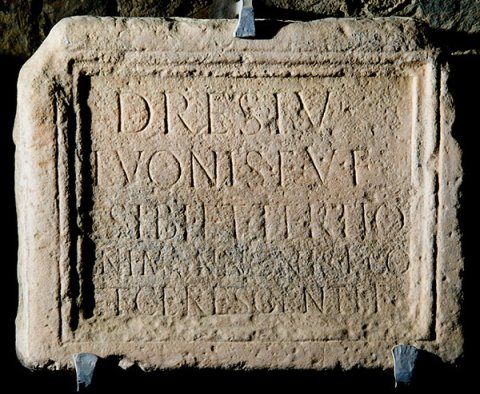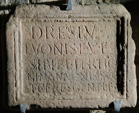 - Dresiu / Luonis f(ilia) v(iva) f(ecit) / sibi et Tertio/ni Mannonis f(ilio) co(niugi) / et Crescenti f(ilio)