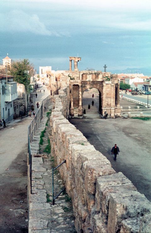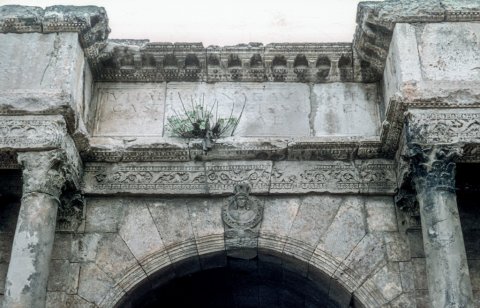 Viertoriger Ehrenbogen (Quadrifrons), auf den Schlussteinen der Durchgänge Tondi, darin Büsten (Westseite: Göttin mit Mauerkrone, Tondo von Adler getragen; Ostseite: Minerva, abgeschlagen, unter dem Tondo Jupiter-Ammonmaske oder Gorgoneion ?. Südseite: Tondo von Löwen getragen, Büste unkenntlich. Nordseite: zerstört).