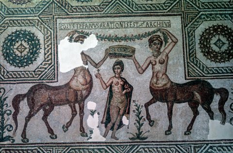 - Mythische Figuren: Venus zwischen zwei weiblichen Kentauren, die ein Diadem und eine Girlande über sie halten. Darüber Inschrift.