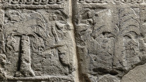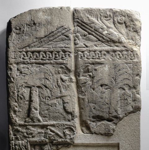 - Eingeschriebener Giebel mit Rosette zwischen Blättern, auf den Giebelschrägen Halbpalmetten. Unter dem Giebel Flechtband. Bildfeld mit Krater zwischen Dattelpalmen. Auf den Rahmenleisten des Schriftfeldes oben Efeuranke, seitlich Weinranken.