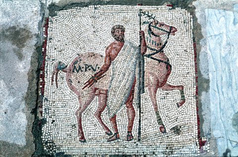 - Pferd mit Namensbeischrift, davor stehender bärtiger Mann in Mantel und Sandalen, in der Linken Stab, in der Rechten ?