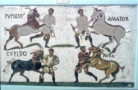- vier Rennpferde mit Namensbeischriften, von ihren Führern am Zügel gehalten