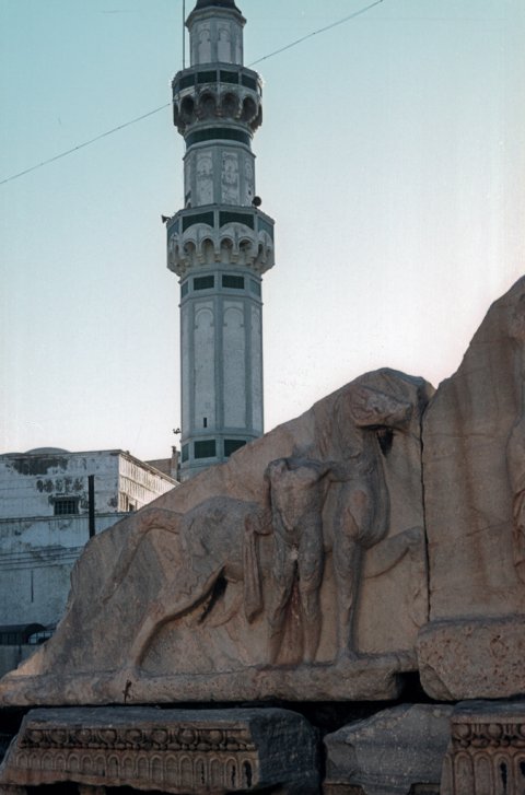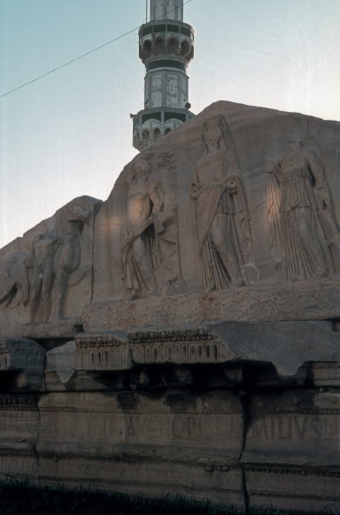 - Mythische Figuren: im Zenturm steht Tyche zwischen Apollo und Minerva, seitlich Dioskur mit Pferd. Unterhalb Architrav mit zweizeiliger Inschrift.