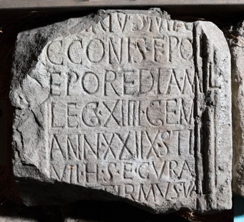 - Virius Ma/cconis f(ilius) Pol(lia) / Eporedia mil(es) / leg(ionis) XIIII gem(inae) / ann(orum) XXIIX stip(endiorum) / VII h(ic) s(itus) e(st) / cura/[vit?] Firmus Val/[---] / [---]PS / [---