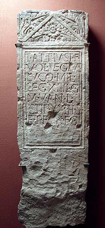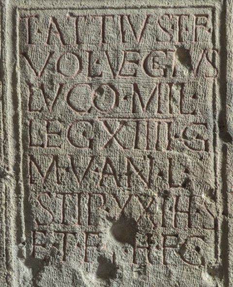 - T(itus) Attius T(iti) f(ilius) / Vol(tinia) Vegetus / Luco mil(es) / leg(ionis) XIIII g(eminae) / M(artiae) v(ictricis) an(norum) L / stip(endiorum) XXI h(ic) s(itus) / e(st) t(estamento) f(ieri) i(ussit) h(eres) f(aciendum) c(uravit)