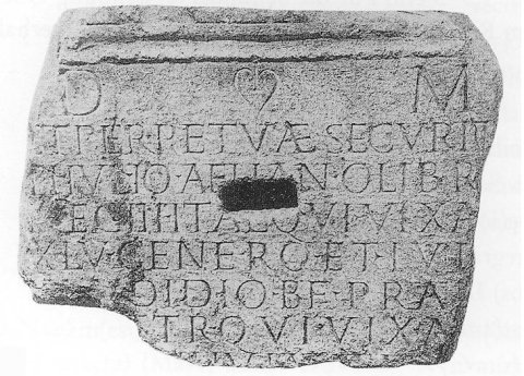 - D(is) M(anibus) / et perpetuae securit[a]/ti Iulio Aeliano libr[ar(io)] / leg(ionis) III Ital(icae) qui vix(it) a[nn(os)] / XLV genero et Iul[io] / Candidio b(ene)f(iciario) pra[ef]/[ecti ca]str(orum) q(ui) vix(it) a[nn(os) ---] / [---]I(?)I vixit an[n(os) ---] / [---