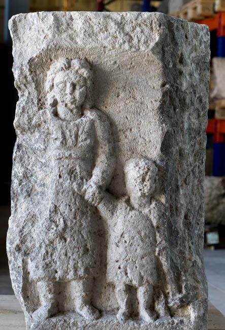 - Auf der Vorderseite Familie: Ganzfiguren eines Ehepaares mit Kind. Auf der rechten Nebenseite Frau in gegürtetem Ärmelkleid und Schuhen, an der linken Hand Kind (Knabe).