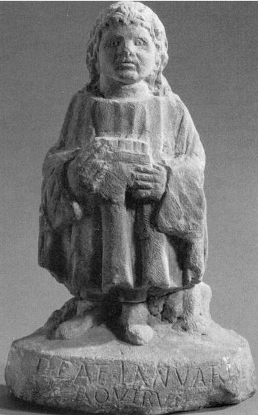 - Knabe (?) im Ärmelgewand, in den Händen Musikinstrument (Syrinx). Auf dem runden Sockel Inschrift.