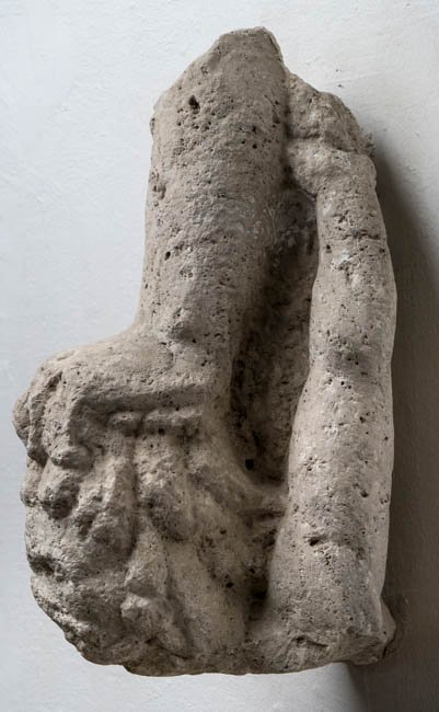 - Linker Unterarm einer überlebensgroßen Figur (Kaiser ? Jupiter ?), die Hand ist auf den Kopf eines bärtigen Barbaren gestützt, der seinen linken Arm nach oben streckt.