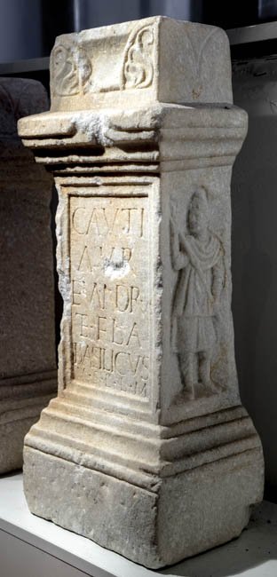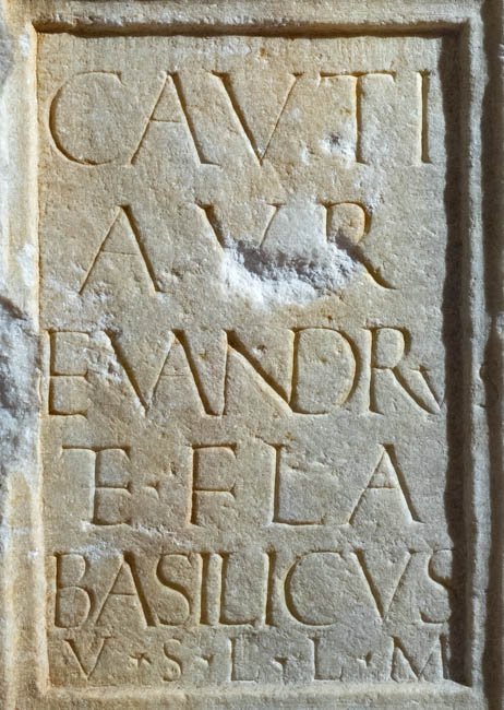 - Cauti / Aur(elius) / Euandrus / et Fla(vius) / Basilicus / v(otum) s(olverunt) l(ibentes) l(aeti) m(erito)