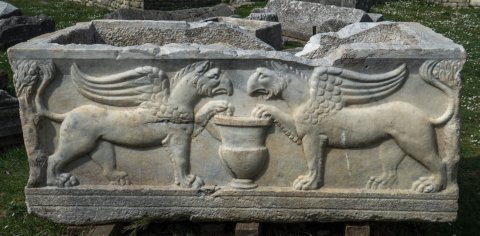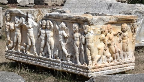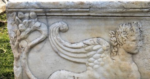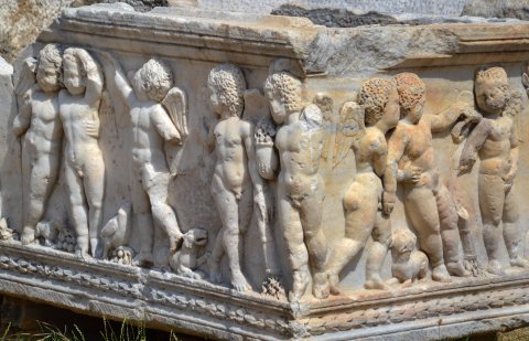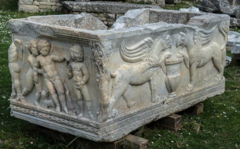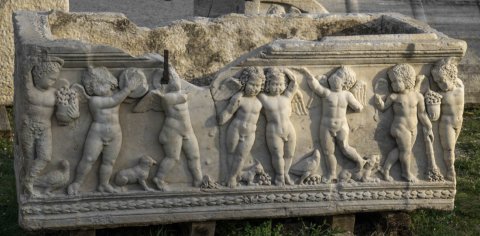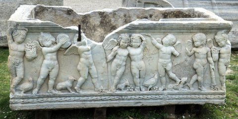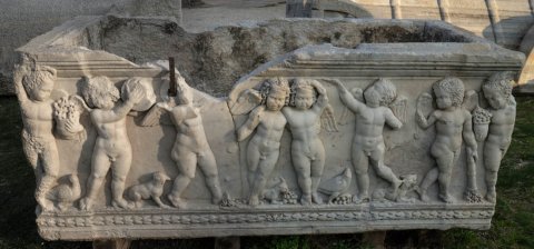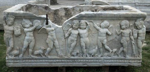 - Mythische Figuren: auf der Vorderseite dionysische Eroten mit Fruchtkörben, Musikinstrument (Tympanon), Fackel. Zwischen ihren Füßen Tiere. Auf den Schmalseiten rechts weitere Eroten, links Sphinx. Auf der Rückseite Gefäß zwischen zwei stehenden Greifen, an den Ecken Baum. Lokale Kopie eines attischen Vorbildes.