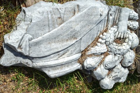 - Relief von einer Sarkophag-Vorderseite: Büste eines Mannes in Toga contabulata auf profiliertem rundem Sockel. An seiner linken Seite Unterarm und Hand mit Kranz einer kleineren Figur (Victoria ? Genius ?), darunter Ansatz einer Fruchtgirlande.