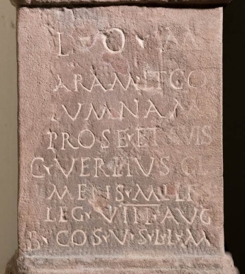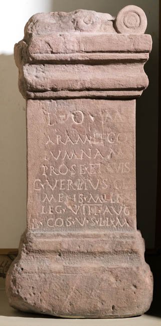 - I(ovi) O(ptimo) M(aximo) / aram et co/lumnam / pro se et s[uis] / C(aius) Vereius C[l]/emens miles / leg(ionis) VIII Aug(ustae) / b(ene)f(iciarius) co(n)s(ularis) v(otum) s(olvit) l(ibens) l(aetus) m(erito)