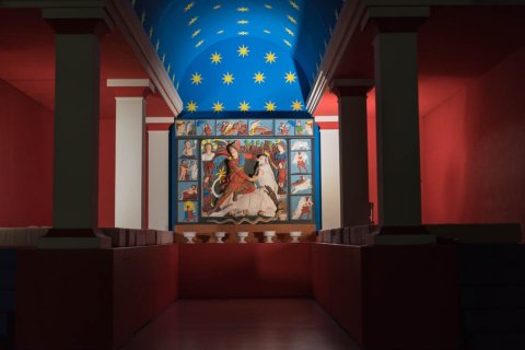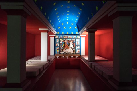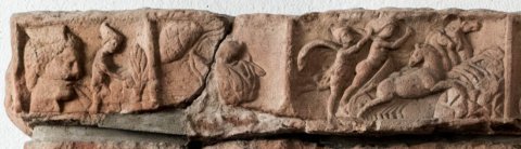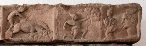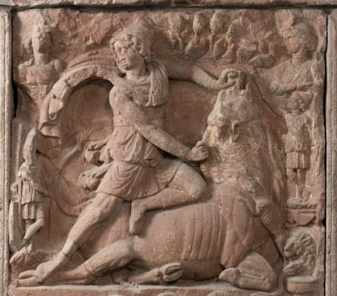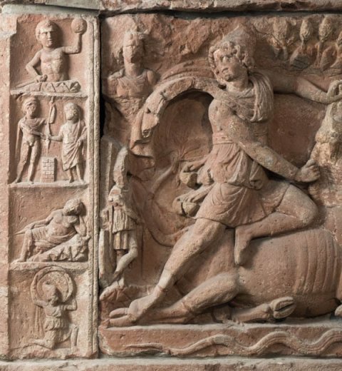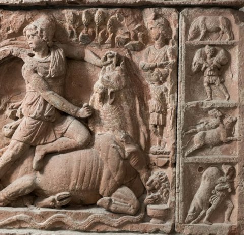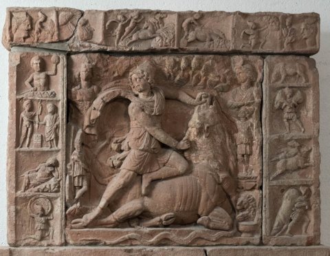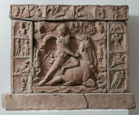 - Mythos (Mithras): Stiertötung (Tauroktonie) mit Cautes und Cautopates, oben Büsten von Sol und Luna. Auf den rahmenden Blöcken oben und seitlich rechteckige Felder mit weiteren Szenen aus dem Mithras-Mythos.
