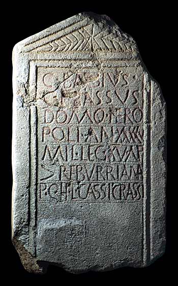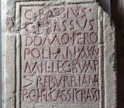 - C(aius) Baebius / C(ai) f(ilius) Bassus / domo (H)iero/poli an(norum) XXXXV / mil(es) leg(ionis) XV Ap(ollinaris) / |(centuria) Reburriana / p(ositum) c(ura) h(eredis) L(uci) Cassi Crassi