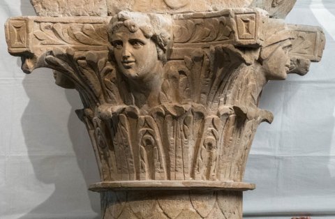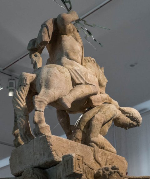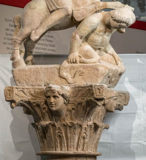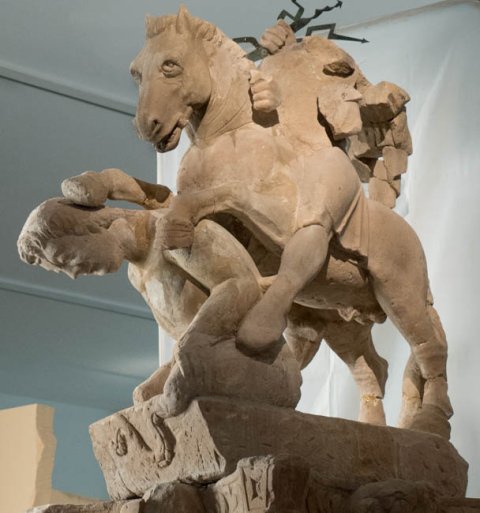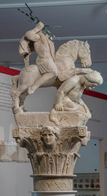 - Mythische Figuren: über einen Giganten hinweg reitender Jupiter mit Blitzbündel, auf einem Kapitell mit Büsten von Jahreszeiten.