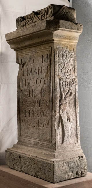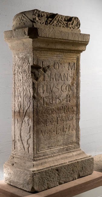 - I(ovi) O(ptimo) M(aximo) / L(ucius) Mansue/tius Cons/tans b(ene)f(iciarius) / co(n)s(ularis) pro / se et suos(!) / v(otum) s(olvit) l(ibens) l(aetus) m(erito)