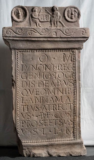 - I(ovi) O(ptimo) M(aximo) / Iunoni Reg(inae) / Genio loci / dis deabus/que omnib(us) / L(ucius) Annama/tius Atrect/us b(ene)f(iciarius) co(n)s(ularis) / pro se et suis / v(otum) s(olvit) l(ibens) l(aetus) m(erito)
