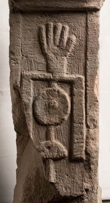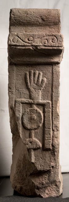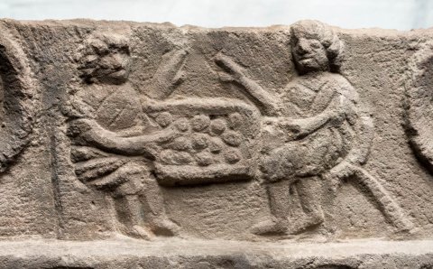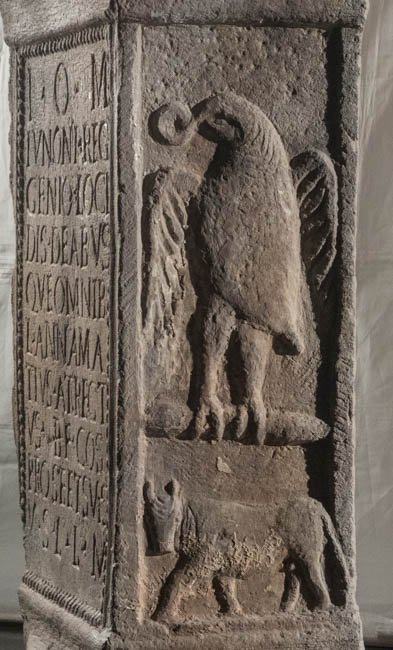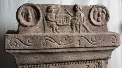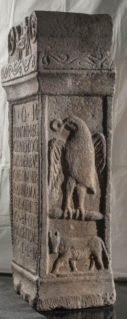 - Pulvini mit Masken, dazwischen figürliches Relief (zwei Männer beim Brettspiel ?). Auf dem Rand der Deckplatte Ranke. Auf den Nebenseiten links Feldzeichen (signum), rechts Adler und Stier. Schriftfeld von tordiertem Band umrahmt.