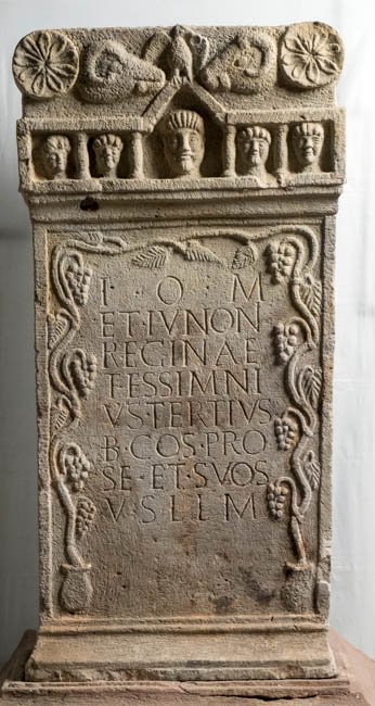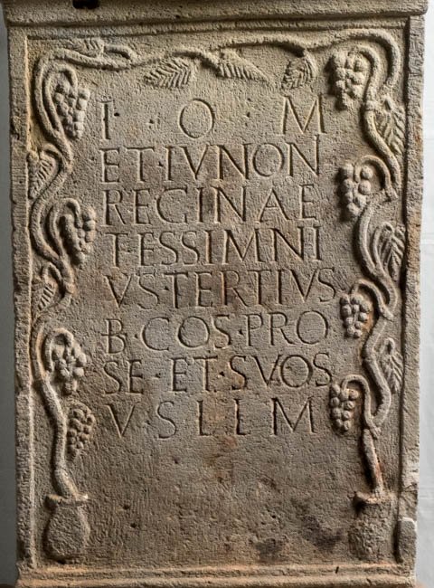 - I(ovi) O(ptimo) M(aximo) / et Iunoni / Reginae / T(itus) Essimni/us Tertius b(ene)f(iciarius) co(n)s(ularis) pro / se et suos(!) / v(otum) s(olvit) l(ibens) l(aetus) m(erito)
